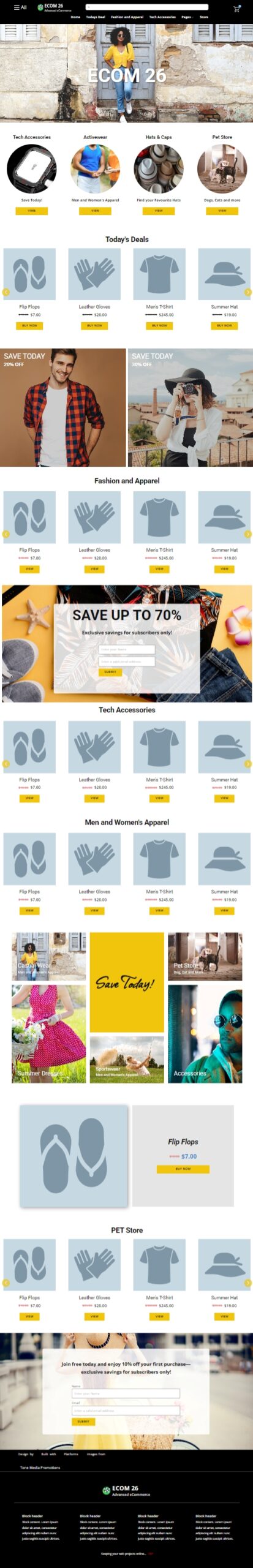 Included Pages 🎉 • Home Page – Your eye-catching main hub 🏠 • Today’s Deal – Highlight hot offers 🔥 • Tech Accessories – Sleek gadgets & gear 🔌 • Fashion & Apparel – Style that stands out 👗 • Hats & Caps – Trendy headwear 🧢 • Pet Store – Cute products for furry friends 🐾 • About Us – Share your story 🌟 • FAQ’s – Quick answers your customers need ❓ • Contact Us – Easy customer communication 📬 • Blog Page – Share content with style ✍️ • Post Page – Clean design for individual posts 📰 • Terms of Use – Stay legally covered 📜 • Privacy Policy – Build trust and transparency 🔐 • Sitemap – Smooth navigation for users & SEO 🗺️